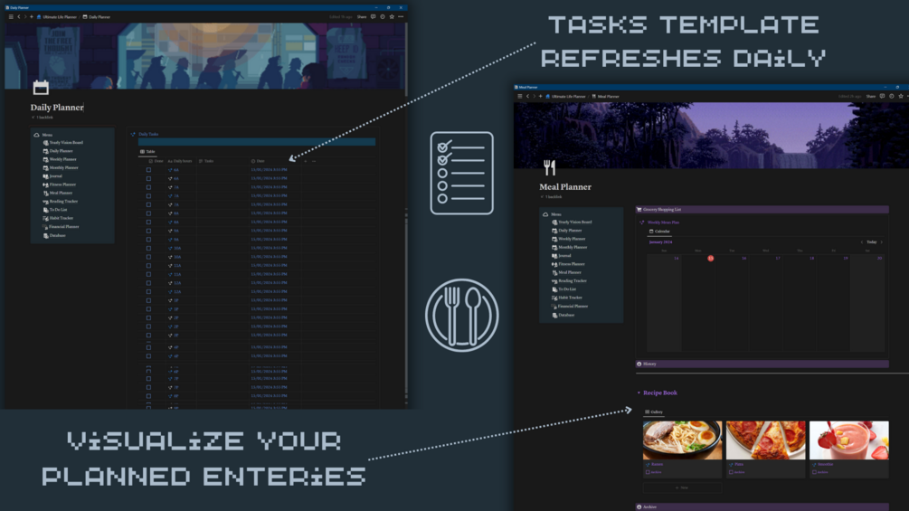 - Immerse in an atmospheric dark arcade environment for an exciting planning experience. - Gain access to comprehensive planning tools, from daily to financial, designed with dark and gaming aesthetics. - Craft a vision board and track fitness and meals with a thrilling twist. - Elevate your life with the Ultimate Life Planner - Dark Arcade Edition. VIDEO GUIDE AND THE TEMPLATE LINK